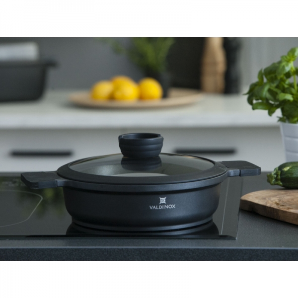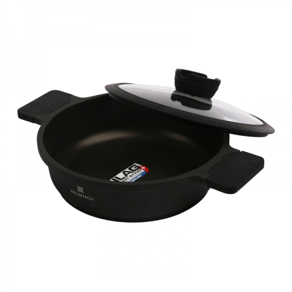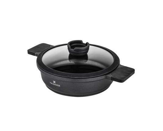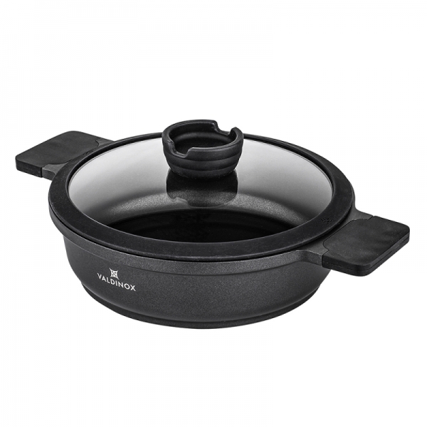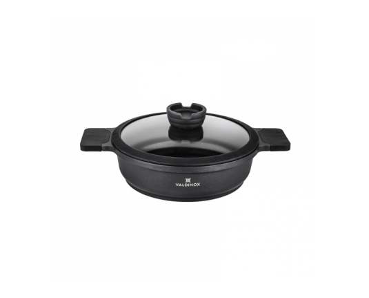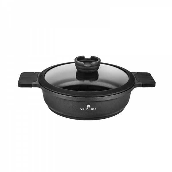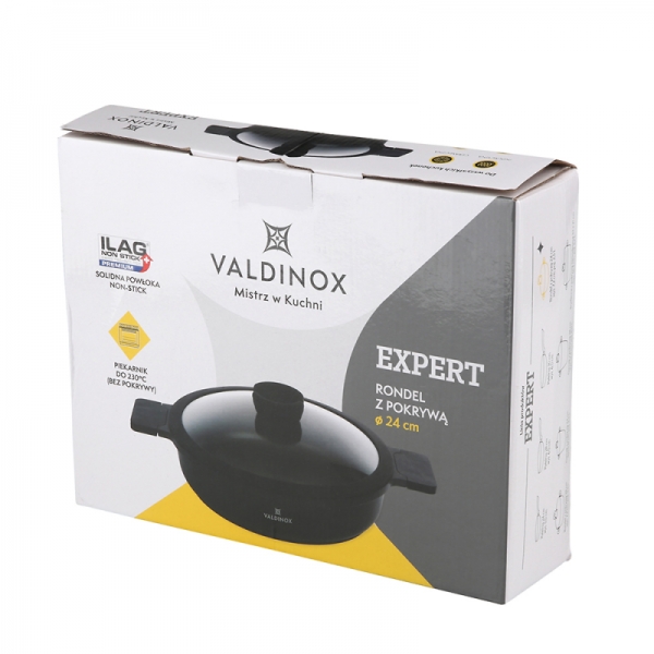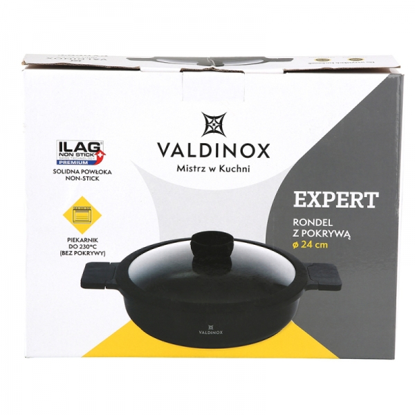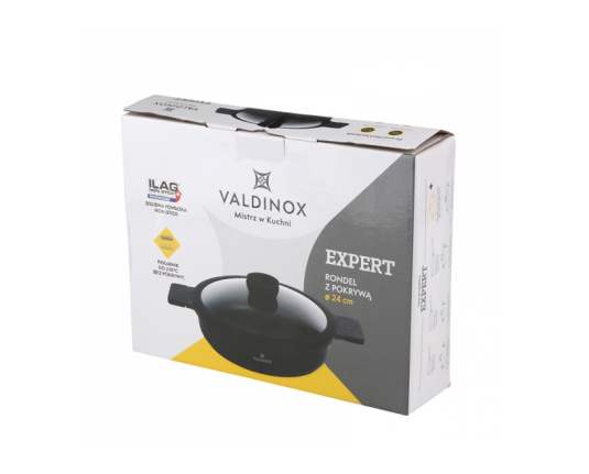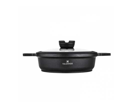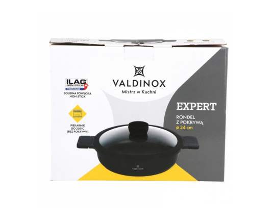 Tava je opremljena integriranom ručkom otpornom na toplinu s mat teksturom. Na taj se način ručka neće odvrnuti i slomiti, kao što se događa u tradicionalnim tavama. Tava iz kolekcije Valdinox Expert izrađena je od jednog komada lijevanog aluminija. Zatim je tretiran trostrukim slojem Illag Premium neprijanjajućeg premaza. Iz tih razloga, tava je čvrsta i zahtijeva malo masti da se prži u njoj. Tavu je vrlo lako održavati čistom. Dimenzije 24 cm Kapacitet 2,5 litara