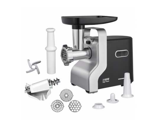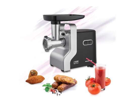 Heinner MG-2100BKSL aparat za mljevenje mesa, maksimalna snaga: 2100W, kapacitet sjeckanja: 1,8 kg / min, nož od nehrđajućeg čelika, 2 brzine, 3 sita za rezanje, pribor od rajčice, pribor za kobasice, Obrnuta funkcija, Razina buke: 90 dB Težina 3,85 kg Visina 31,40 cm Širina 16,40 cm Dubina 34,50 cm