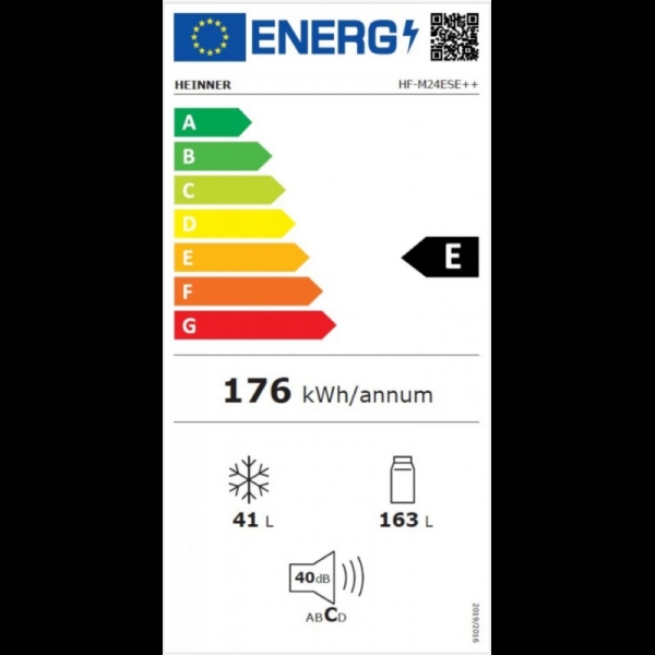 Hladnjak s dvoja vrata Heinner HF-M24ESE++ hladnjak, ukupnog kapaciteta 204 L, pri čemu kapacitet hladnjaka iznosi 163 L, a zamrzivača 41 L. Uređaj pripada energetskom razredu učinkovitosti E te ima elektroničko upravljanje s podesivim termostatom. Opremljen je LED rasvjetom i staklenim policama. Dimenzije hladnjaka su 55 × 55 × 143 cm, a dostupan je u srebrnoj boji.