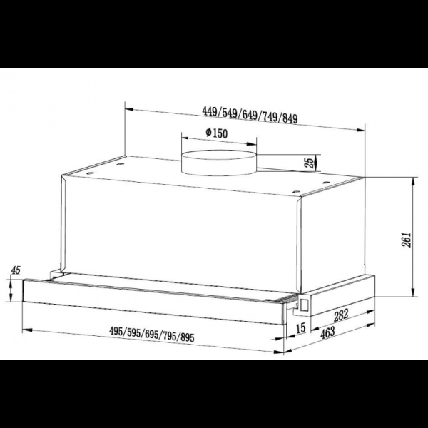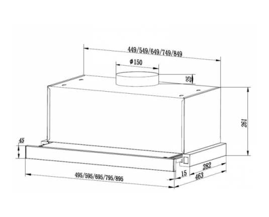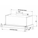 60 cm, Maksimalna apsorpcijska snaga: 611,7 m3/h 2 razine brzine, motor: 1 x 200W LED svjetlo: 2 x 1,5W 2 aluminijska filter promjer ispušne cijevi: 150 mm, dimenzije (WxHxH): 59,5x(30-46,3)x29 cm, Boja: Crna+Staklo